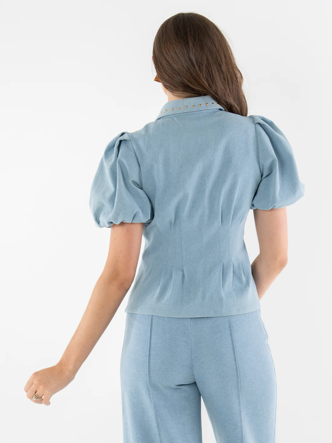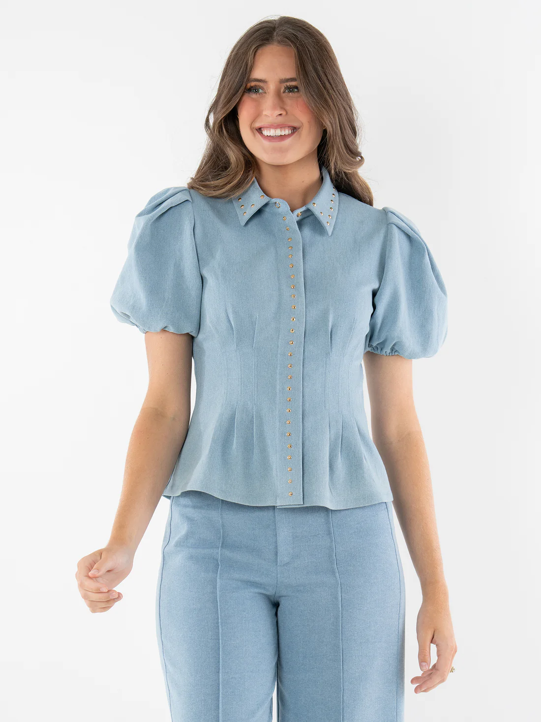 The Britt Top redefines denim with a feminine edge. Featuring a classic fold collar, puff sleeves with elastic cuffs, and a lightly boned bodice, this style offers both structure and ease. A concealed front button closure is framed by a gold-studded panel, adding a subtle western-inspired detail. Crafted in stretch denim, it flatters the figure while providing comfort, making it as timeless as it is on trend.