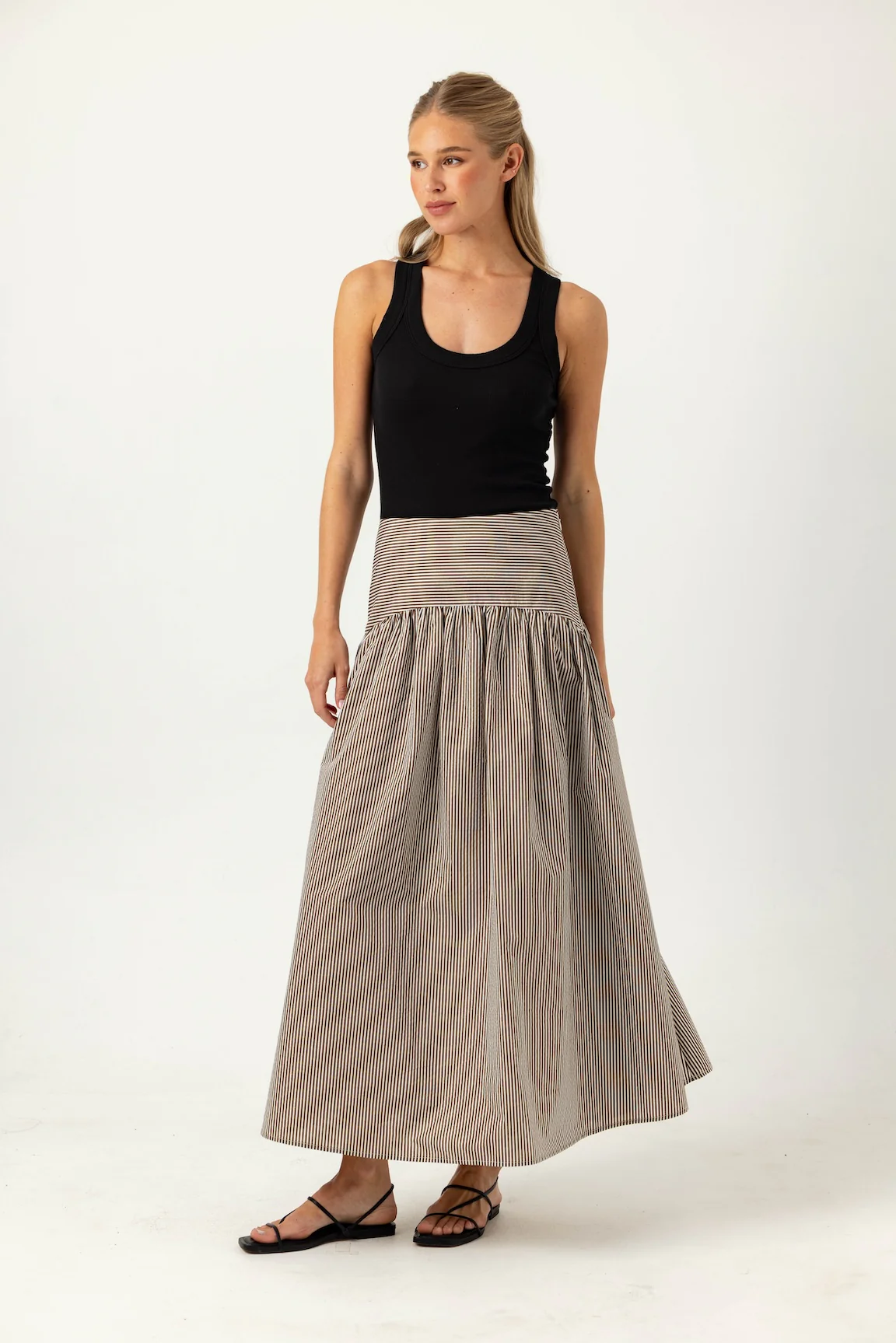 An update to the classic maxi skirt with an elongated, slimming asymmetric waistband