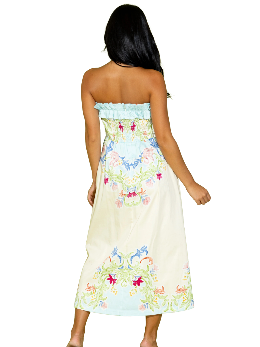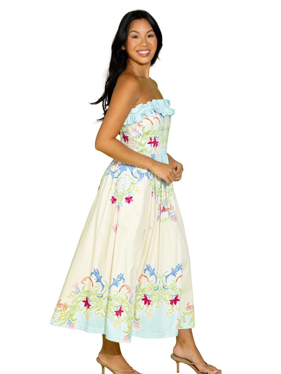 Whether it's a wedding or a weekend getaway, the Catherine Dress in Chateau is the perfect choice, keeping you comfortable and cool while looking oh so cute! This strapless dress features a ruffle bodice detail and midi length.