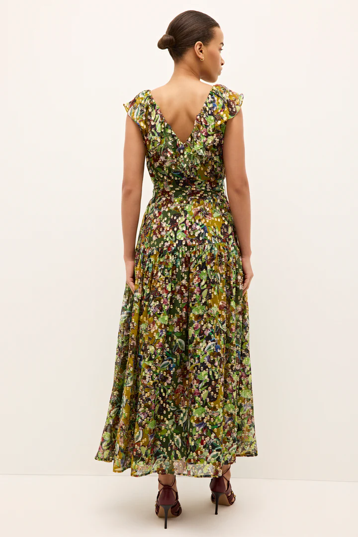 Combining the golden appeal of metallic dots and an autumn floral Bloom print, a slip-on silhouette makes you feel as elegant as you look with its comfortable silk construction, while an optional tie sash can further tailor the dress to you. Sweetly feminine but with a bit of edge, you can glam it up with heels or keep it more casual with knee-high boots and a jacket.