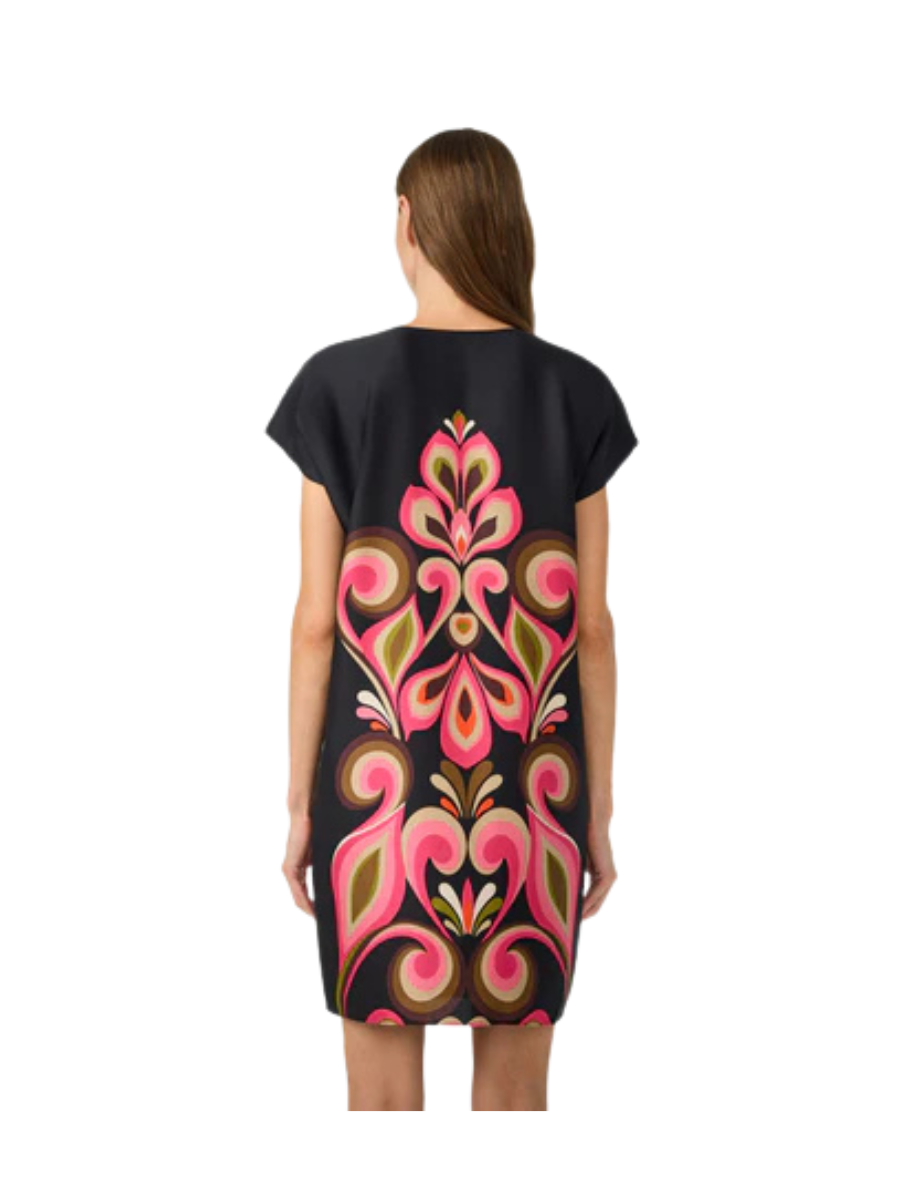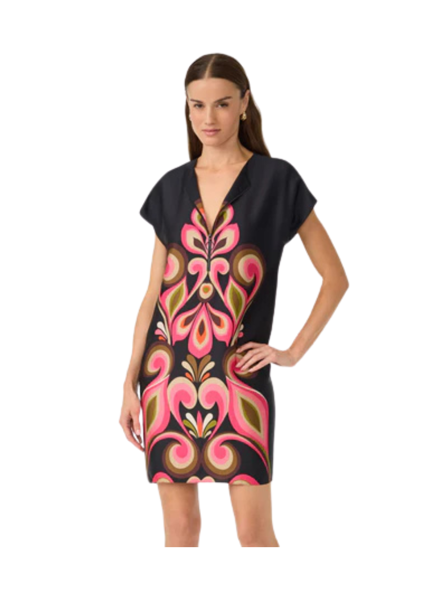 The Hasil is a satin georgette dress, that features a short sleeve with an extended shoulder, crewneck, fun half-zip front, and beautiful, eye-catching print. Sophisticated and effortlessly sexy, this mini dress is flattering and versatile, making it ideal for your next event - day or night.