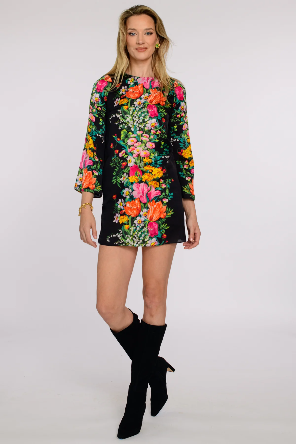 Juliette is the shift of the season with her long bell sleeves and flattering silhouette. We love her in this stunning Centerpiece Black print, perfect for the Fall and Holiday seasons.