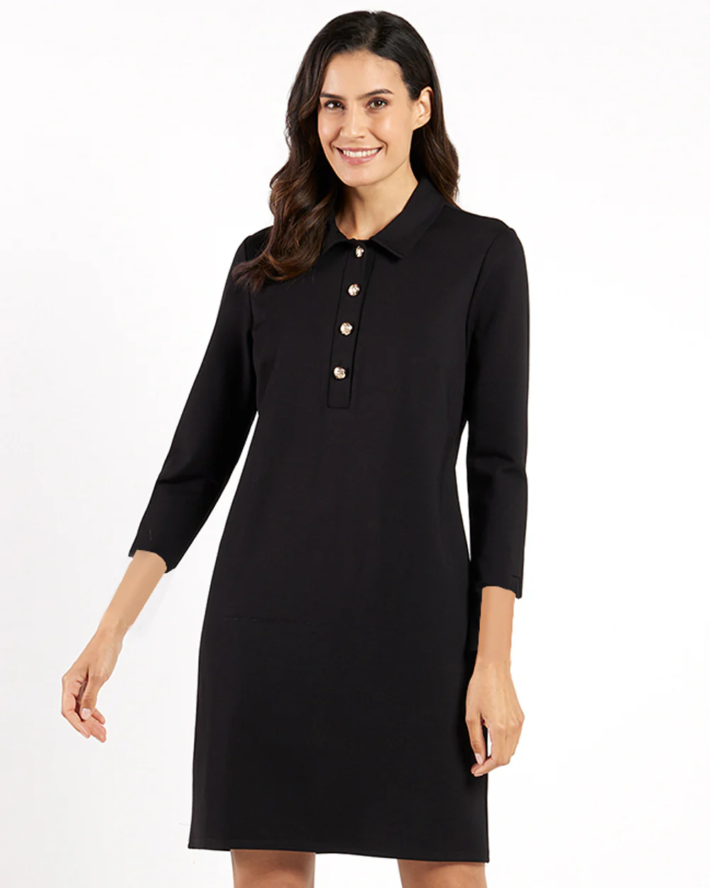 The Midge Dress is sophisticated and timeless, this new sheath-style dress features a classic point collar and 3/4 sleeves for a refined silhouette. Gold button detailing adds a touch of elegance, making it a beautiful wardrobe staple that you can wear all year round.