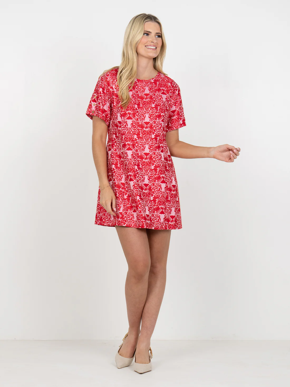 The Royale Shift is a classic shift dress reimagined with a playful pink-and-red design featuring unexpected cheetah faces. Designed with a crew neckline, short sleeves with gold button detail, and flattering princess seams, it offers a tailored yet loosely structured silhouette. An easy everyday shape with an elevated twist, perfect for making a statement in comfort this holiday season.