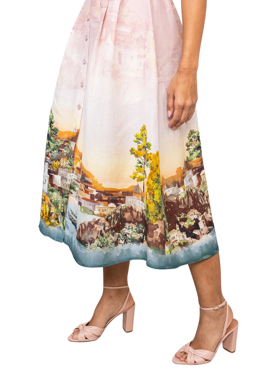 The Via Knotch Collar Midi Dress is crafted in linen viscose, this short-sleeve midi features a notch collar neckline, front button closure, and a self-fabric belt that defines the waist with subtle precision. Soft pleats through the skirt add shape without volume, allowing the dress to sit comfortably through the day. Rendered in a soft pink base, the ROME print unfolds as placed artwork across the bodice and hem, showcasing architectural scenes and hand-illustrated details directly printed onto the fabric. Designed to feel polished yet wearable, this dress holds its form while remaining light on the skin.