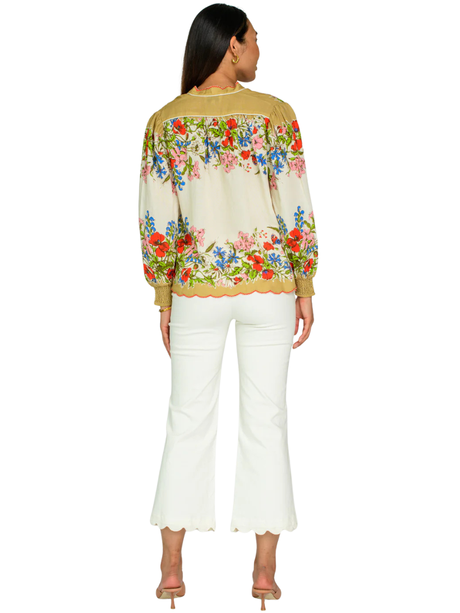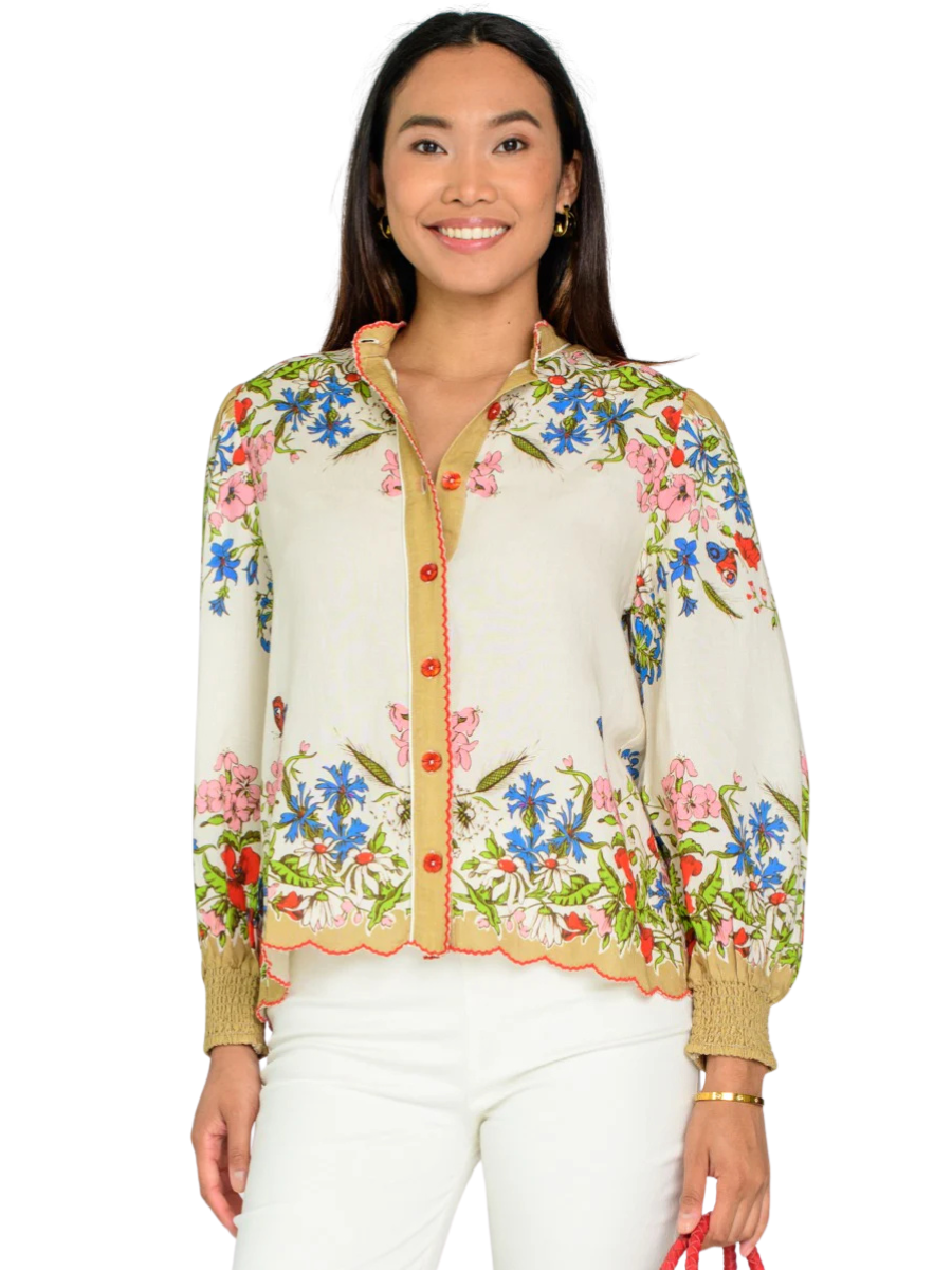 Cut from a light linen blend fabric, the Emily top in Butterfly Garden is the perfect button front blouse to dress up or down this season. She features a mandarin collar, balloon sleeves, and flower shaped buttons, and her design is finished off with delicate embroidery edges.