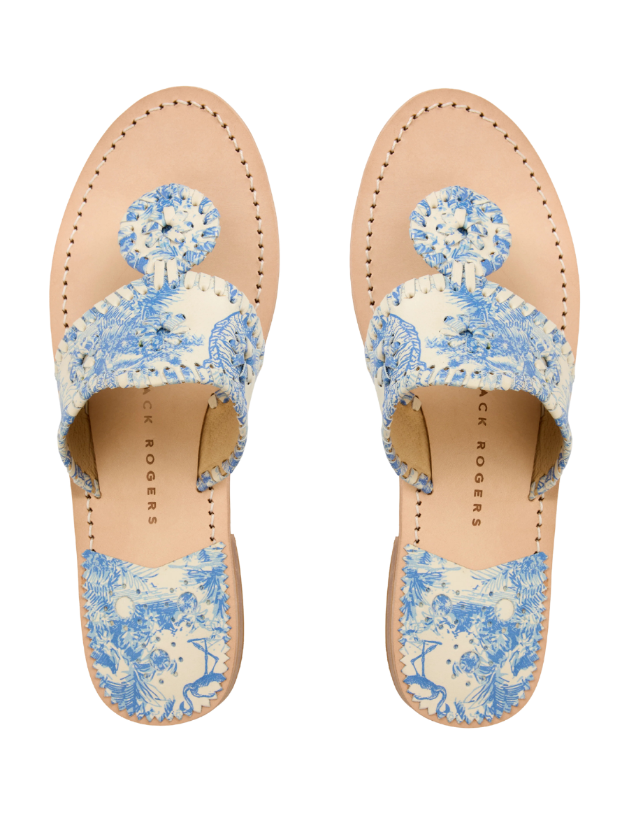 The Jack Rogers Jacks Flat Sandal in toile Nappa leather brings a refined, heritage-inspired feel to a classic silhouette. Crafted in Italy, the detailed toile pattern adds visual interest and character while maintaining an elegant, understated profile. Designed for spring and summer wear, it offers a polished option that elevates everyday warm-weather styling.