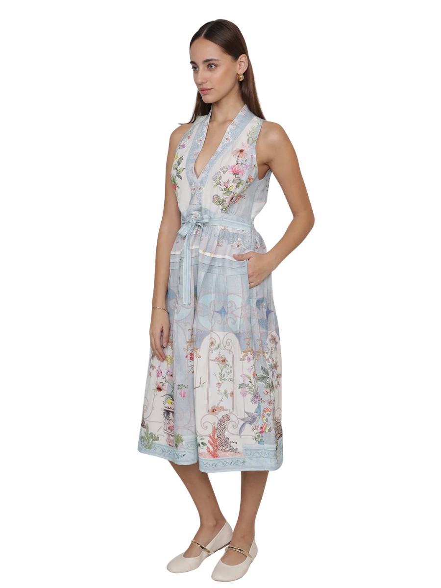 A light, airy silhouette shaped with intention, Ranna Gill's Nysa Pleated Halter Midi Dress, crafted in linen viscose for a breathable, comfortable wear. The sleeveless halter neckline frames the shoulders cleanly, flowing into a deep V with printed borders that highlight the neckline. Set on a soft powder blue base, the Trellis print features layered floral and architectural artwork placed across the bodice and skirt in multi color. Fine pleats from the waist down add structure, while the fabric tie detail allows a personalized fit through the midsection.