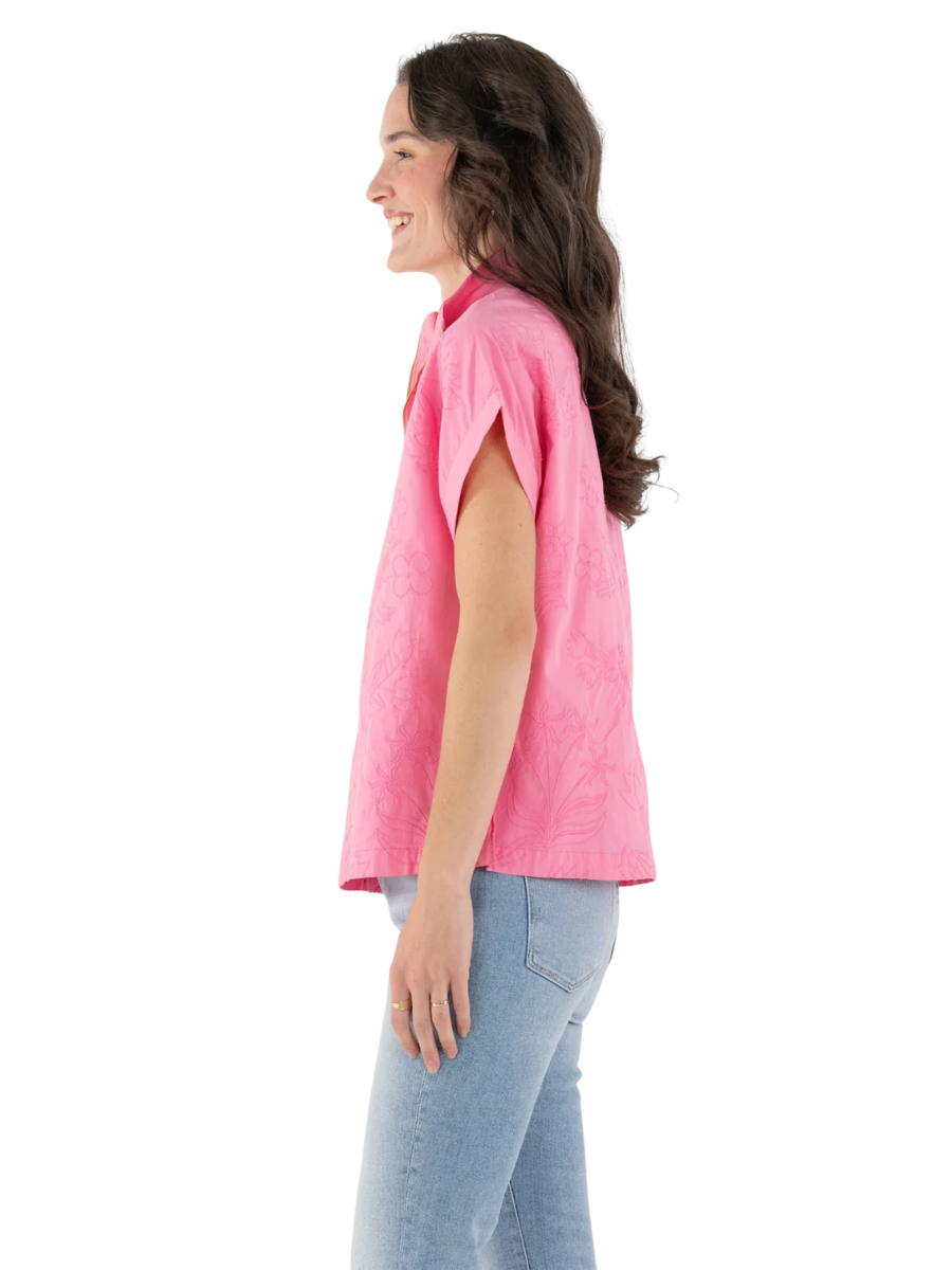 The Poppy Pullover in Rosé is an everyday essential with an easygoing, feminine edge. Designed with a classic stand collar and a ¾-zip neckline finished with our signature gold pull, this style balances structure with ease. Short dolman sleeves and a subtly tailored silhouette create a clean, flattering shape, while tonal embroidered florals lend quiet texture and depth throughout. Elevated yet easeful, it’s a modern pullover that feels considered, distinctive, and undeniably chic.