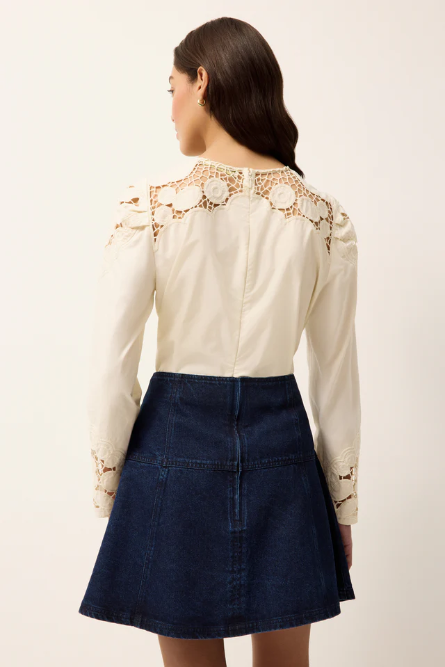 With tailored puff sleeves and lace embroidery tracing the shoulders, neckline, and cuffs, this timeless blouse carries a seasonless sophistication that outlasts any trend.