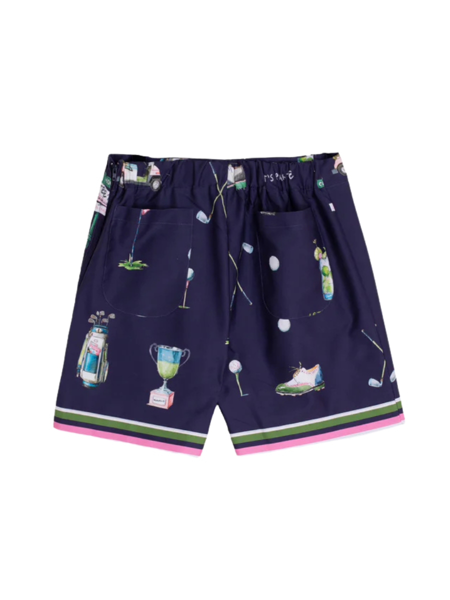 Navy blue shorts with golf-themed prints. They feature an elasticated waistband and large front pockets. The hem is finished with green, pink, and white stripes.