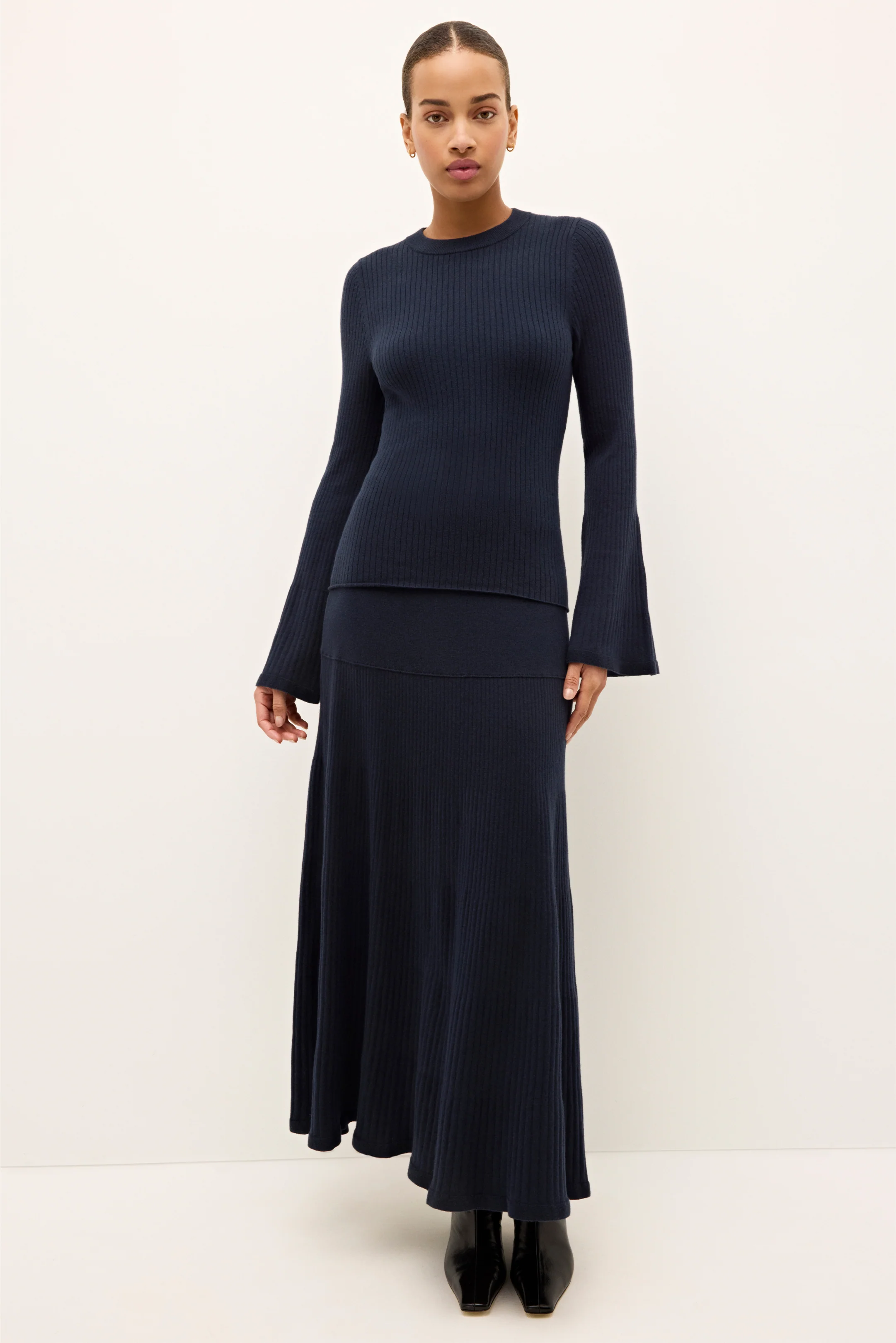 Less really is more when it comes to elevated wardrobe basics like our new figure-skimming Kaylan skirt. The slinky ribbed knit maxi features a drop waist rib yoke, and is fitted through the hips before gently flaring out toward the floor.