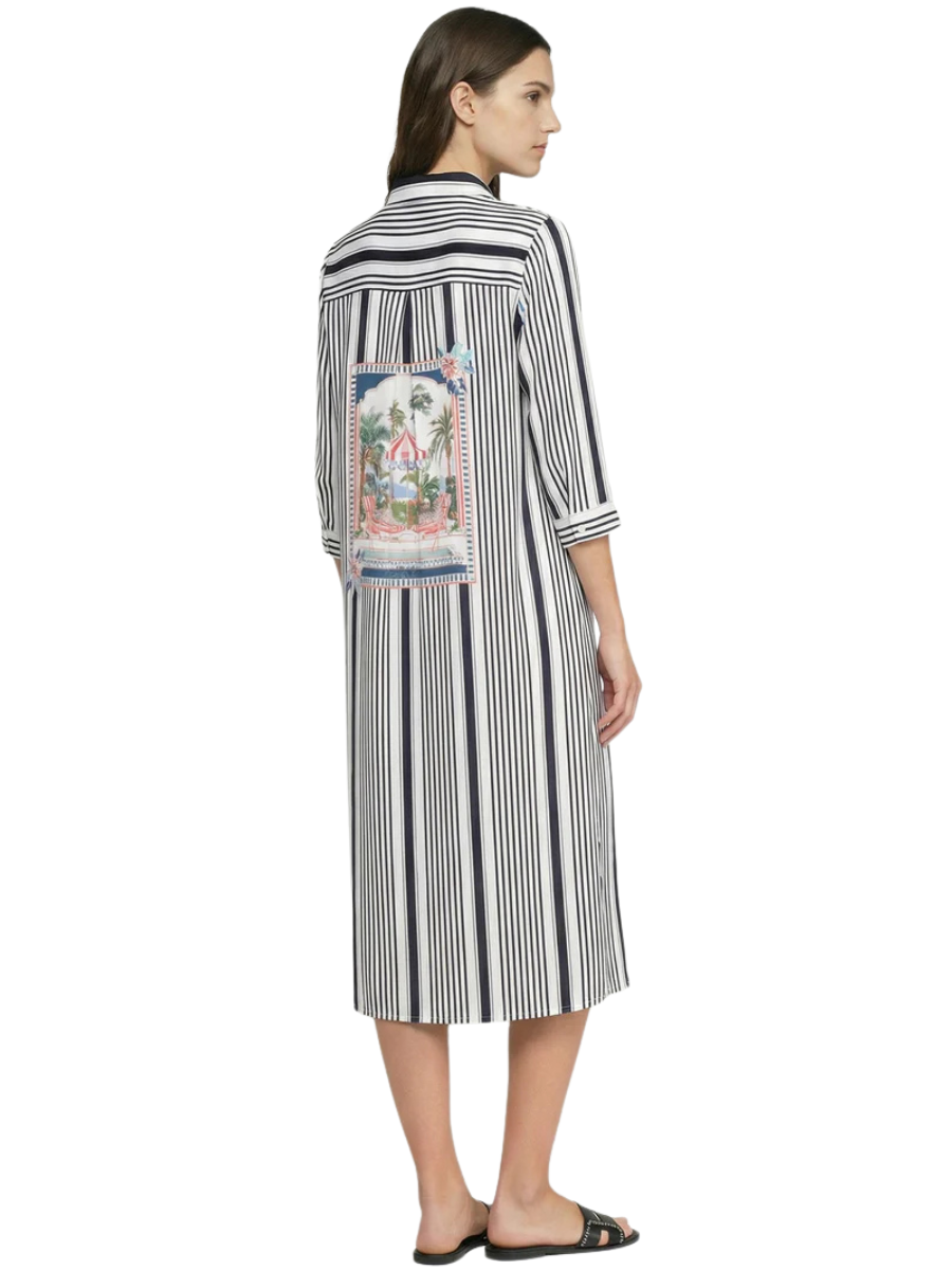 Midi-length shirt dress with a vertical striped print in navy and white. Classic collar and button-front closure. Three-quarter sleeves. Includes a matching fabric belt.