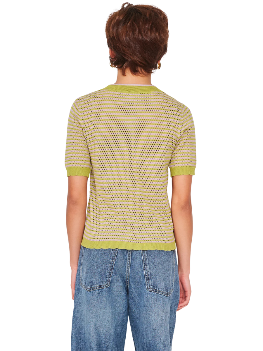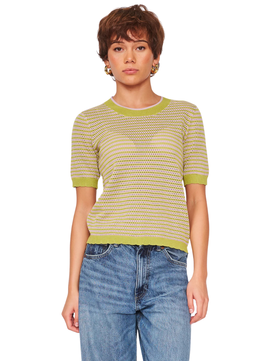 This vintage-inspired open-knit Cora sweater top, in a Lavender Lime Stripe, features delicate scalloped edge sleeves and a contrasting cream athletic band neckline for a sporty yet elegant touch. Lightweight and breathable, it’s perfect for layering or wearing alone to add a subtle retro flair to any outfit