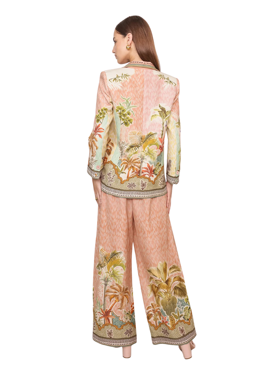 A jacket that frames the body with quiet confidence and visual depth. Crafted in linen viscose, this multi-color piece features the Costa Rica print with layered palm artwork and ornamental borders placed thoughtfully across the surface. Designed with full sleeves and a notch collar that opens into a deep V, highlighted by contrast piping and fine stitch detailing along the edges. The tailored-yet-relaxed fit sits clean on the shoulders and falls fluidly, making it feel structured without feeling stiff.